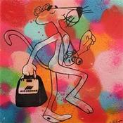 This unique and original contemporary artwork "Pink Panther On Holiday" on the subject of Pop icons has been created by the contemporary artist Kikayou.