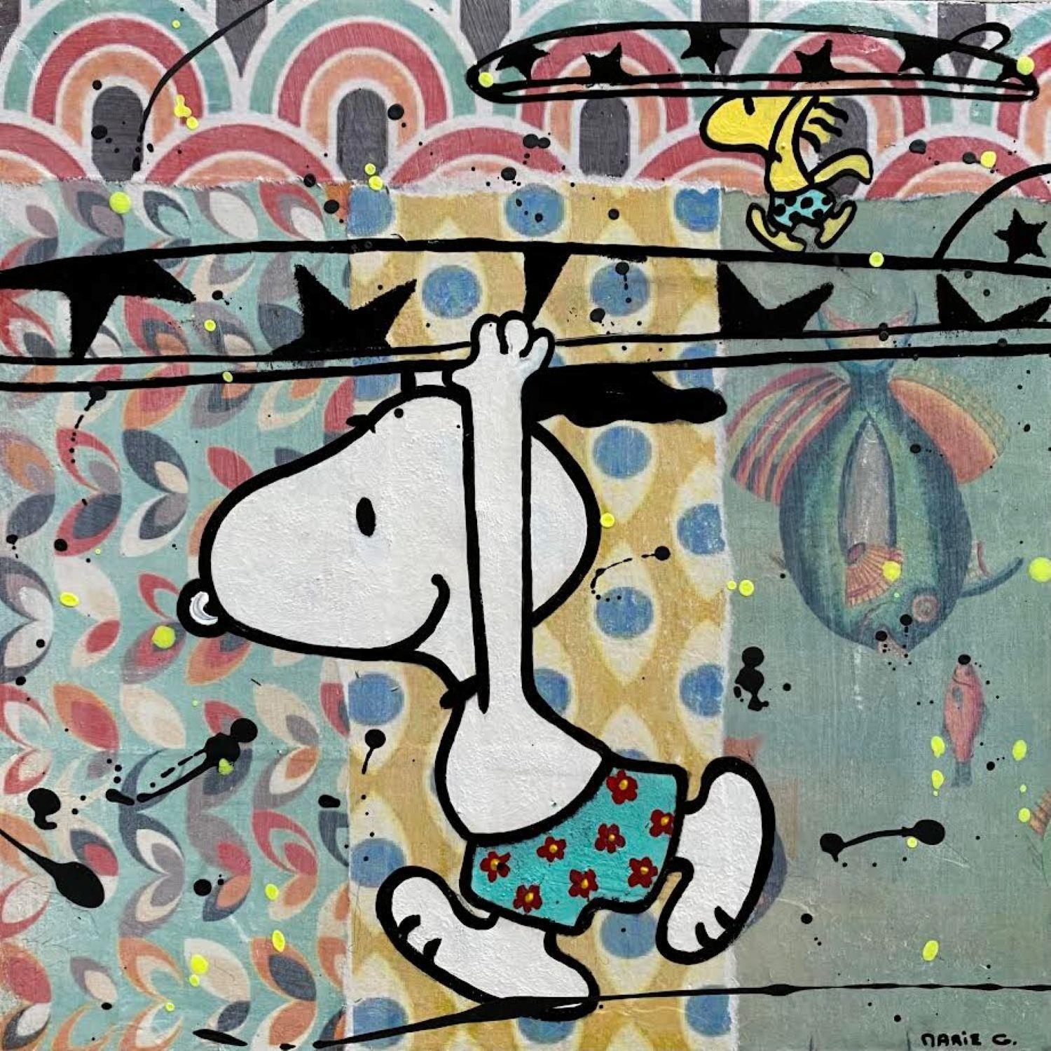 This unique and original contemporary artwork "F3 surfer ensemble" on the subject of Pop icons has been created by the contemporary artist Marie G. .