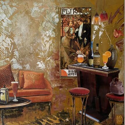 The artist does away with any hierarchy between a cut out and glued image and a painted one worked on with a blade. Since one is based on the other, both practices allow the artist to multiply the textural and material effects. Time and spaces also become blurred as they come into relation with one another. Interior and exterior speak to one another and enter into one another, nostalgia for the past rubs up against the modernity of urbanism, chic and glamorous cafés come into contact with working class living areas and neighborhoods. This "grand voyage" weaves together the various levels of interpretation of the artist's work of art, between black and white and the soft and powdered colors, between memories and the present, between the private and the public, and in this way it touches upon the universality of a situation.