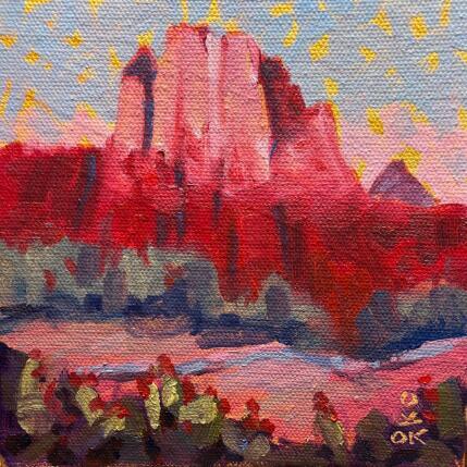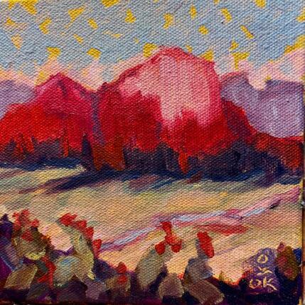 Karen O'Donnell paints in oils, on golden or orange backgrounds that she calls "confetti". This starting tone creates a luminous contrast, often visible in the sky of her landscapes. Her inspiration comes from photos taken in nature - a deer spotted by a trail camera, an insect in full flight or a sunset over red rocks. Her style is reminiscent of Impressionism, influenced by Gretchen Lopez and her own sensitivity to color. Each work is a visual surprise, where unexpected shapes sometimes slip in. Her paintings aim to evoke emotion and joy in the viewer.