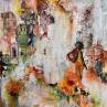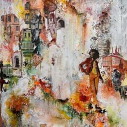 The artist used mixed techniques and acrylic paint, collage, textures, images and other mediums to create this small-format painting on canvas in a semi-figurative, abstract style.