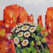 This unique and original contemporary artwork "Saguaro flowers in red rocks" has been created by the contemporary artist Lunetskaya Elena.