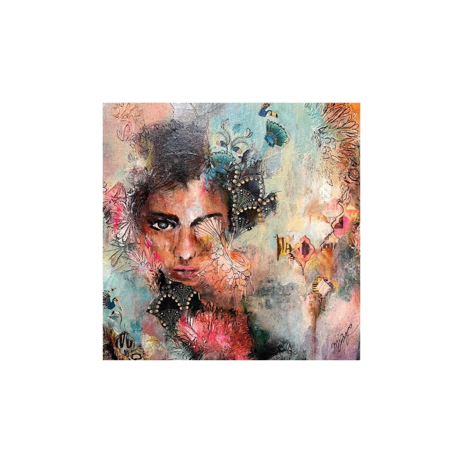 The artist used Oil, Gluing, Acrylic media on Other to create this Figurative, Small size painting.