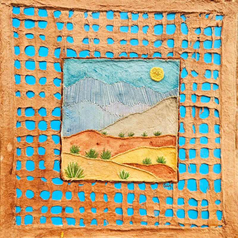 The artist used embroidery and watercolor media on amate paper to create this Subject matter, Small size painting.