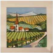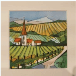 This unique and original contemporary artwork "3 maisons, une église" on the subject of Landscapes has been created by the contemporary artist Langlois Jean-Luc.