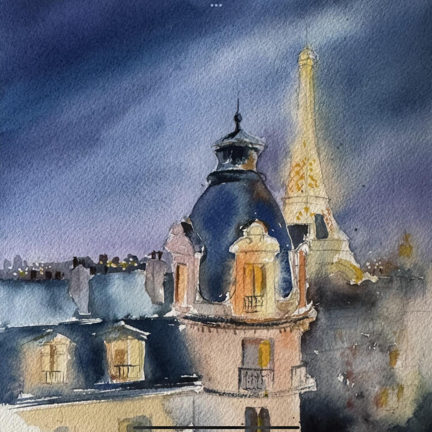 Painting Toits de Paris au crépuscule by Khomyakova Liliya | Painting Figurative Architecture Watercolor