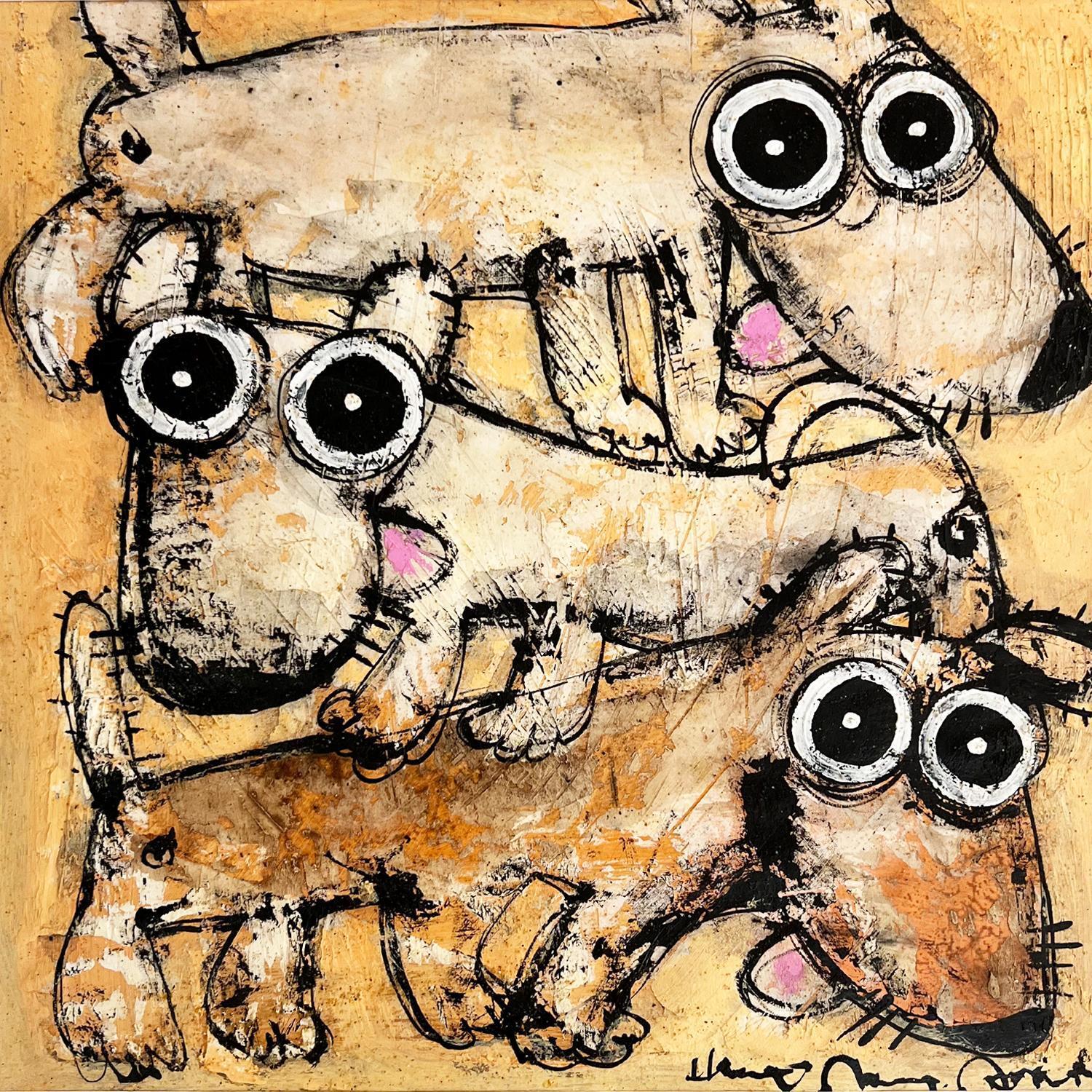 Herve grew up in the Southern Mediterranean region and nothing predestined him for an artistic career. He began his working life rather chaotically and carried out various professions before working in metallurgy for 8 years. It was only by chance that he began to paint. On moving house and decorating his apartment, he looked for art based on animals, but finding nothing, he began creating and decorating the walls with his own paintings. His family then discovered his talent and encouraged him to do become an artist. Various meetings and collaborations with decoration businesses gave Hervé the opportunity to paint freely and exhibit for the first time. He contributed to another artist’s ceramics work and the experience convinced him to embark on an artistic career. More fabulist than naturist, Hervé endows his animal characters with complexity, transforming the bestiary inherited from the medieval tradition, rock paintings and Far Eastern Art.