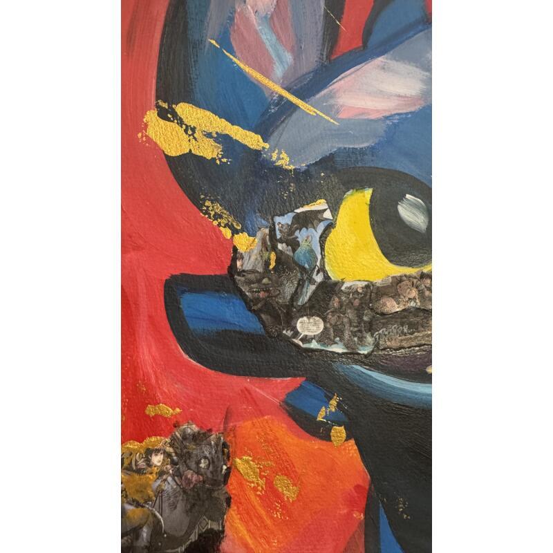 The artist used Acrylic, Gluing media on Paper to create this Pop-art, Small size painting.