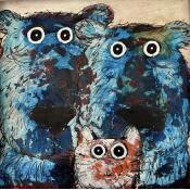 This unique and original contemporary artwork "Minou et les deux ours bleus" on the subject of Animals has been created by the contemporary artist Maury Hervé.