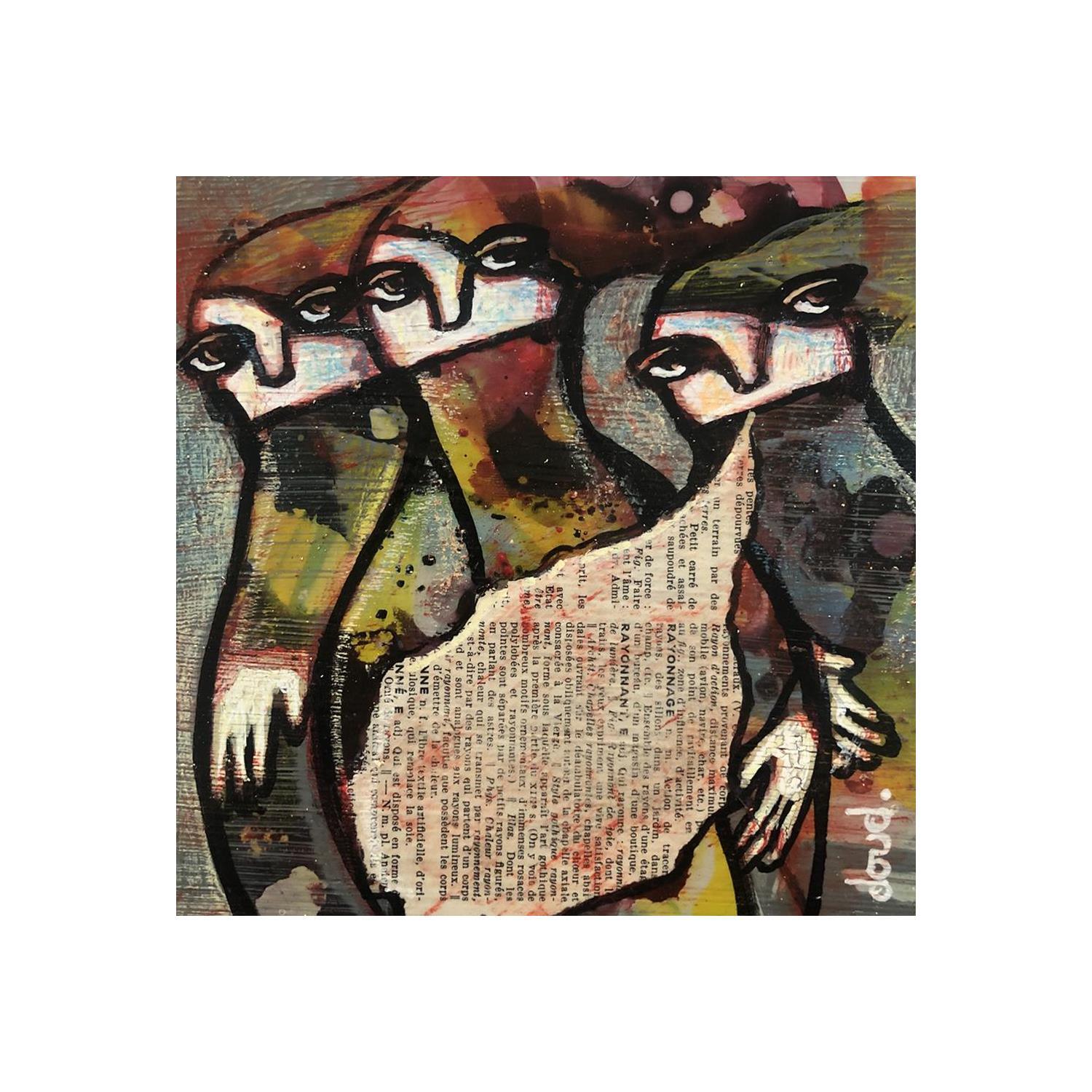 The Breton Loic Tarin, aka Doudoudidon, passed the baccalaureate, then a degree in advertising graphic design. He started off creating images and illustrations, and more recently it clicked into place for him that he should start an artistic life. Influenced by his often technical and scientific readings and listening, he has long wondered about the layout of the universe, Darwinian theories, human sciences… Considering that "he knows nothing", he creates poetic, expressive and intuitive "paintings" (for him painting his first and foremost silent poetry). The idea of distortion of media is the basis of his artistic practice. He likes to use what is initially recyclable waste. He also likes to distort objects like playing cards with themes inspired by the Middle Ages.