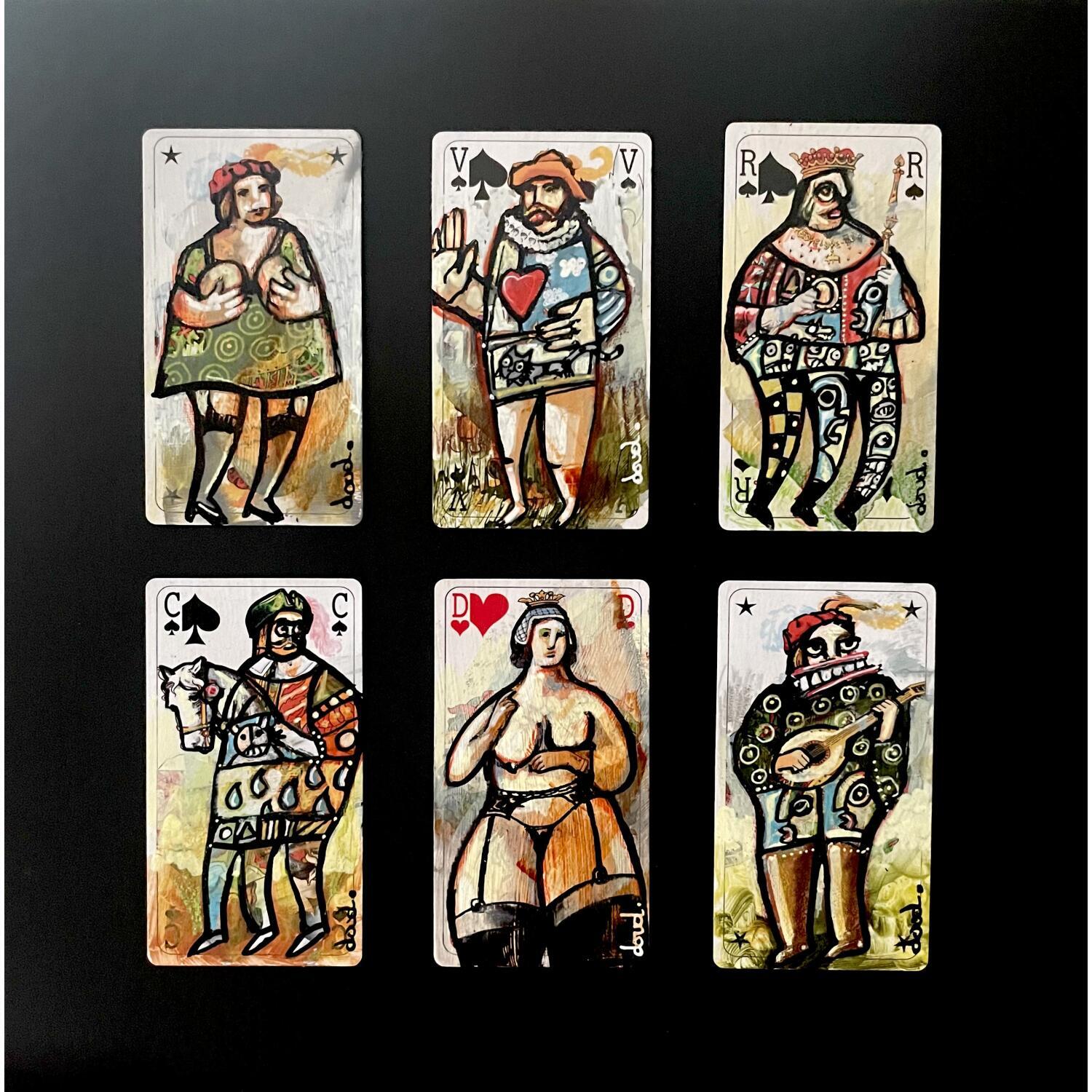 The Breton Loic Tarin, aka Doudoudidon, passed the baccalaureate, then a degree in advertising graphic design. He started off creating images and illustrations, and more recently it clicked into place for him that he should start an artistic life. Influenced by his often technical and scientific readings and listening, he has long wondered about the layout of the universe, Darwinian theories, human sciences… Considering that "he knows nothing", he creates poetic, expressive and intuitive "paintings" (for him painting his first and foremost silent poetry). The idea of distortion of media is the basis of his artistic practice. He likes to use what is initially recyclable waste. He also likes to distort objects like playing cards with themes inspired by the Middle Ages.