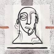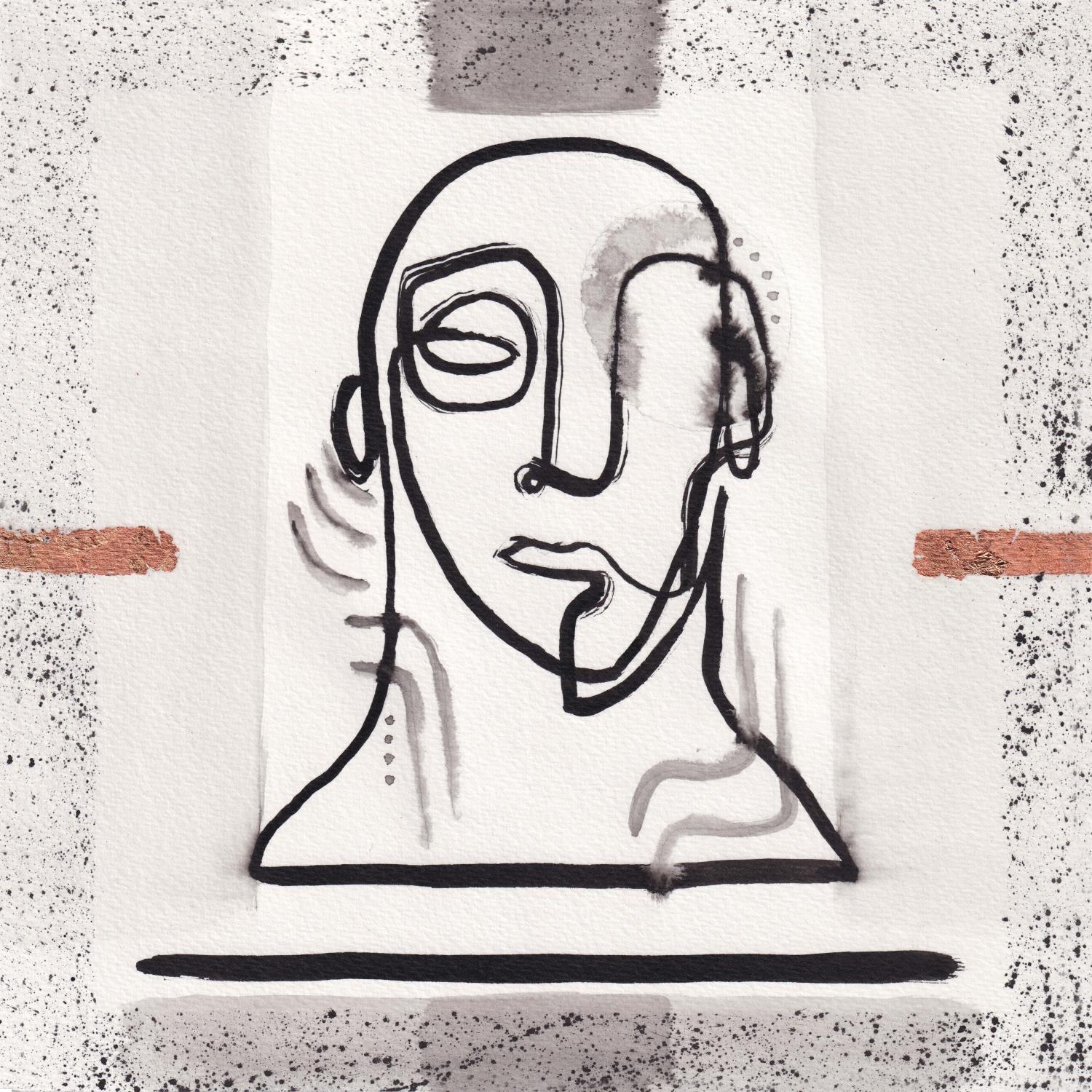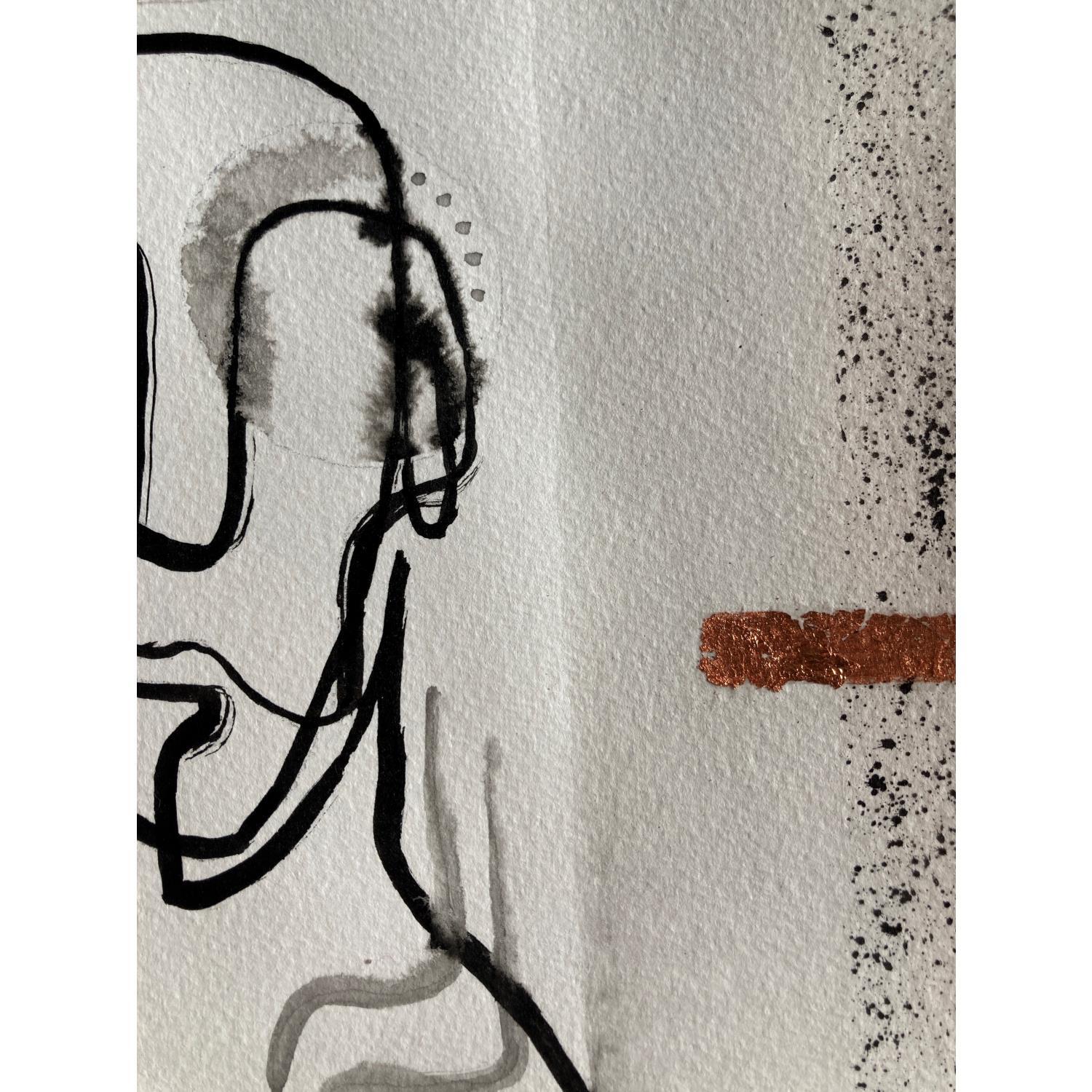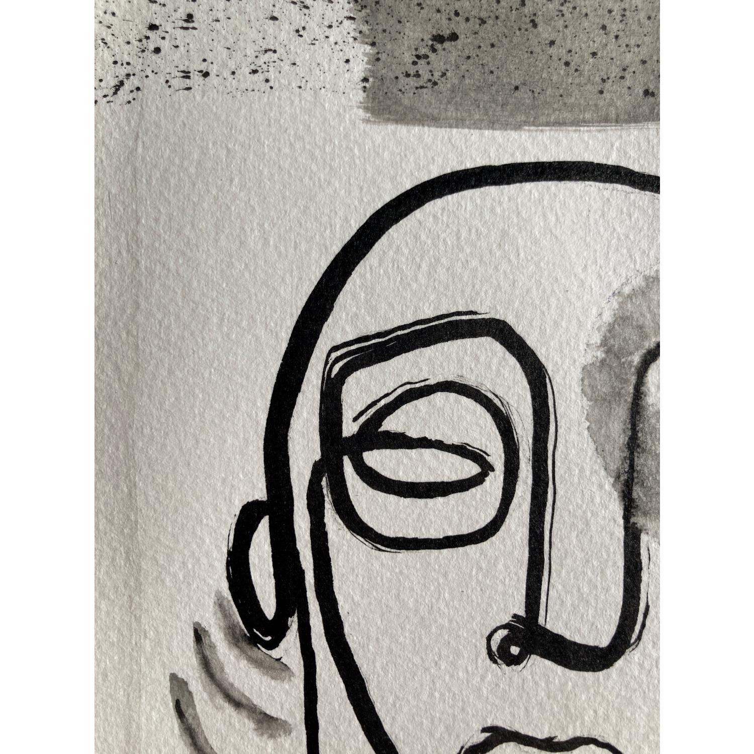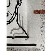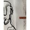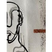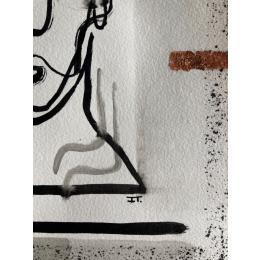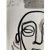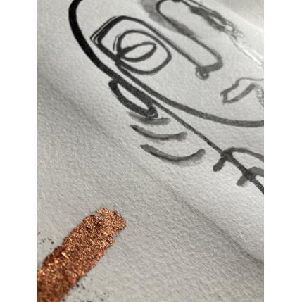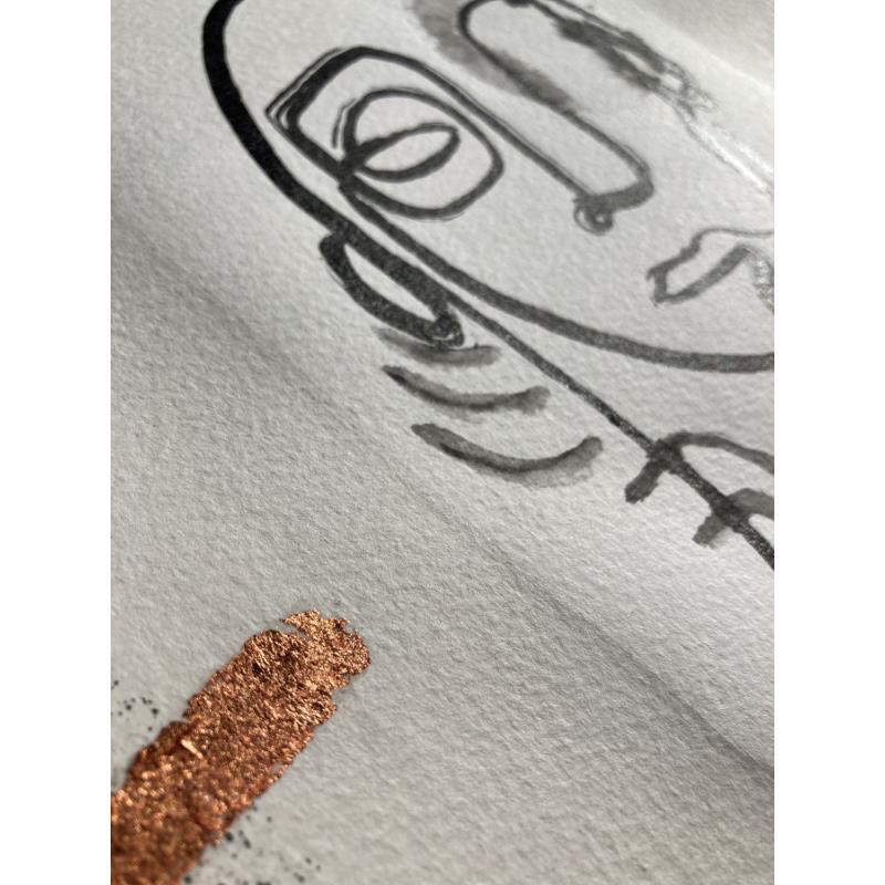 This unique work of art, is a portrait of a person from the front made of a single continuous black line in Indian ink, lacks the right eye, has a few lines in the neck as if it were smoke. you have a frame with black sparks and two characteristic lines at the left and right ends on bronze-colored paper.