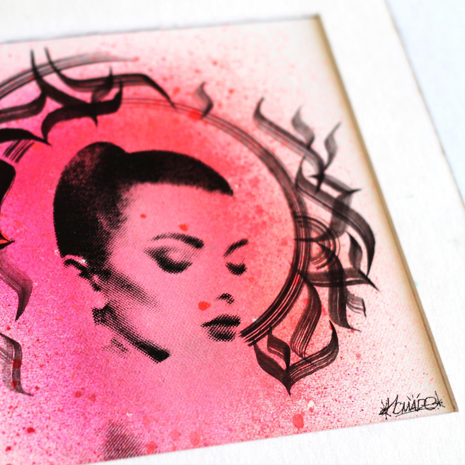 He discovered graffiti and began to paint on the walls, a practice that appealed to him because of its spontaneity and that would never cease to inspire him. Whether through graffiti or calligraphy, Maderno seeks to express himself freely. Driven by a desire to diversify and surpass himself, his works mix abstract painting, calligraphy and portraiture. Just as we find a certain sensuality in the curves of his letters, we find a certain sensitivity in the features of his subjects.