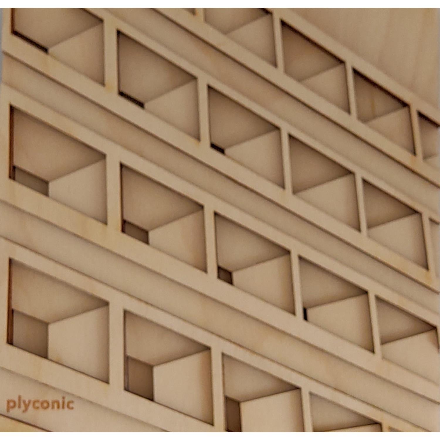 Helen, known by her pseudonym Plyconic, is an East London-based artist with a background in furniture design. Her passion for art blossomed after a captivating visit to London's Barbican Centre, where the interaction of light with architecture deeply inspired her. This decisive moment led her to use plywood, the material of her creations, to capture and recreate the observed play of light.