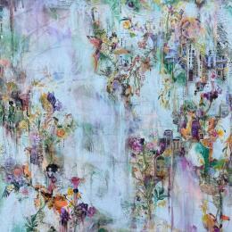 The artist used mixed media and acrylic paint: acrylic, collage, paper, mortar and mixed media on canvas to create this large-format 100x100cm painting.