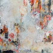 The artist used mixed media and acrylic paint, collage, textures, paper, pastels, inks and posca to create this small-format painting on canvas in a semi-abstract, surrealist style.