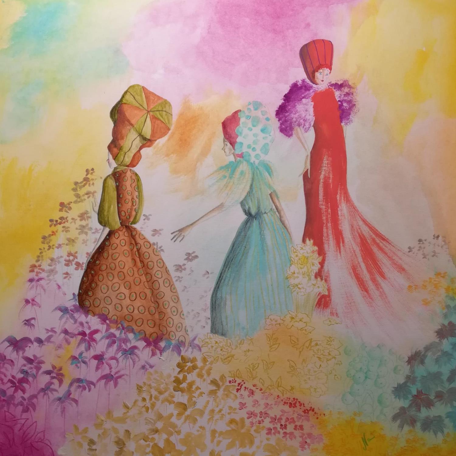 This unique and original contemporary artwork "Le donne del moulin rouge camminano tra i fiori" on the subjects of Music, Nature, Portrait has been created by the contemporary artist Nai.