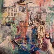 The artist used Oil, Acrylic, Gluing media on Paper to create this Surrealism, Small size painting.