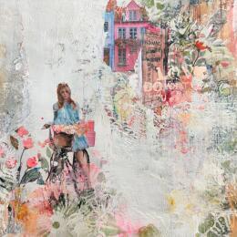 The artist used mixed media and acrylic paint, collage, textures, paper, pastels, inks and posca to create this small-format painting on canvas in a semi-abstract, surrealist style.