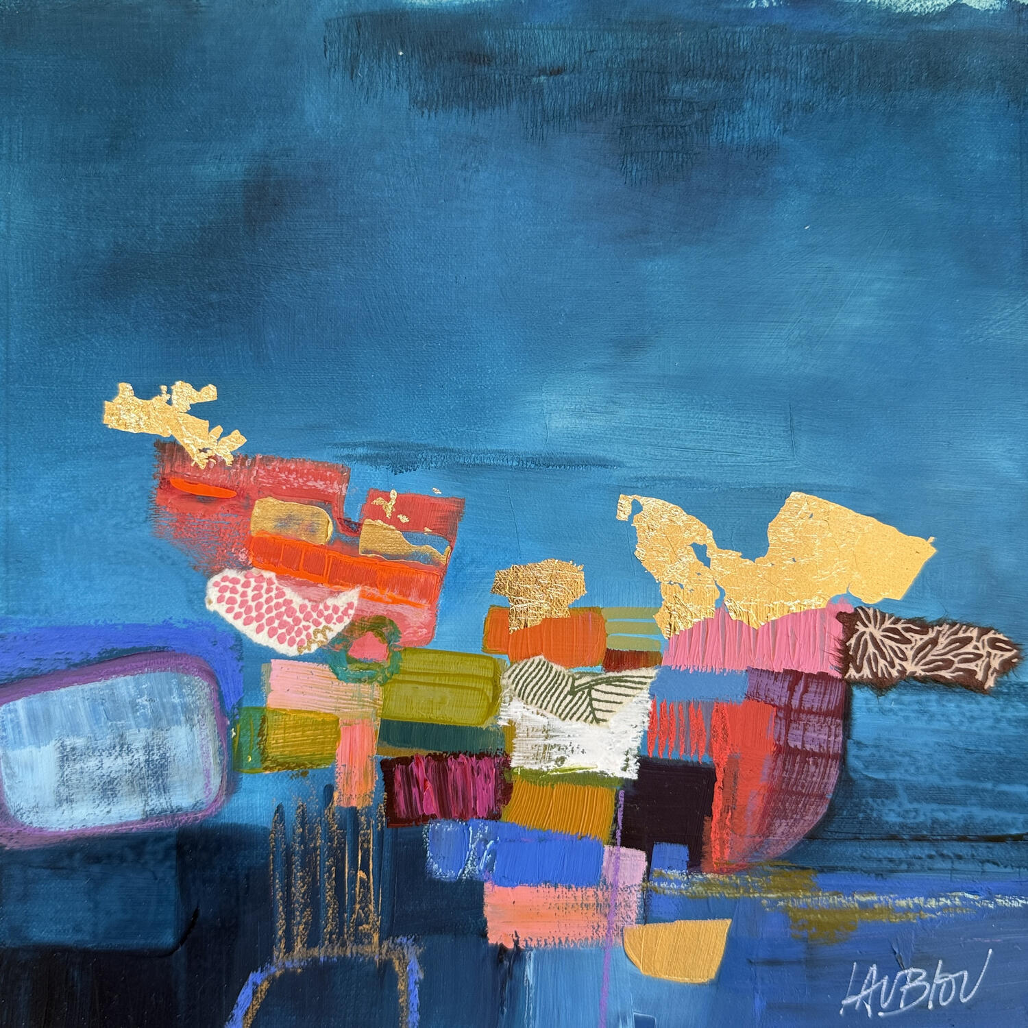 The artist used Acrylic, Cardboard, Gluing, Gold leaf, Pastel media on Canvas to create this Abstract, Small size painting.