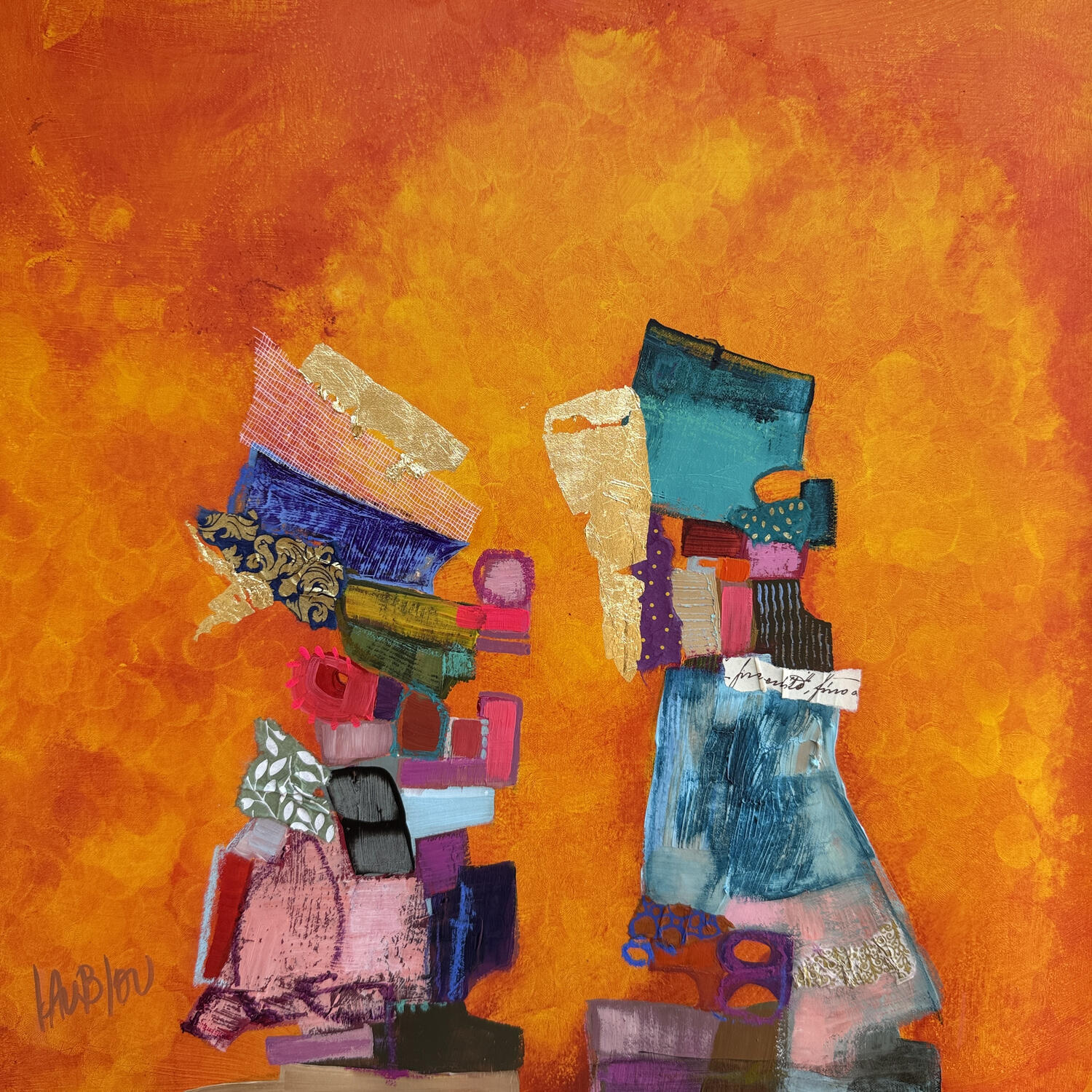 The artist used Acrylic, Cardboard, Gluing, Gold leaf, Pastel media on Canvas to create this Abstract, Small size painting.