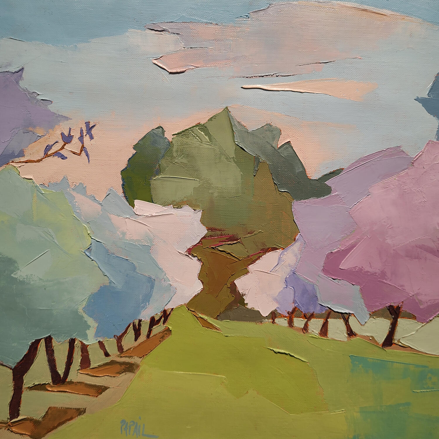 This unique and original contemporary artwork "Le soir tombant sur les oliviers" on the subject of Landscapes has been created by the contemporary artist PAPAIL.