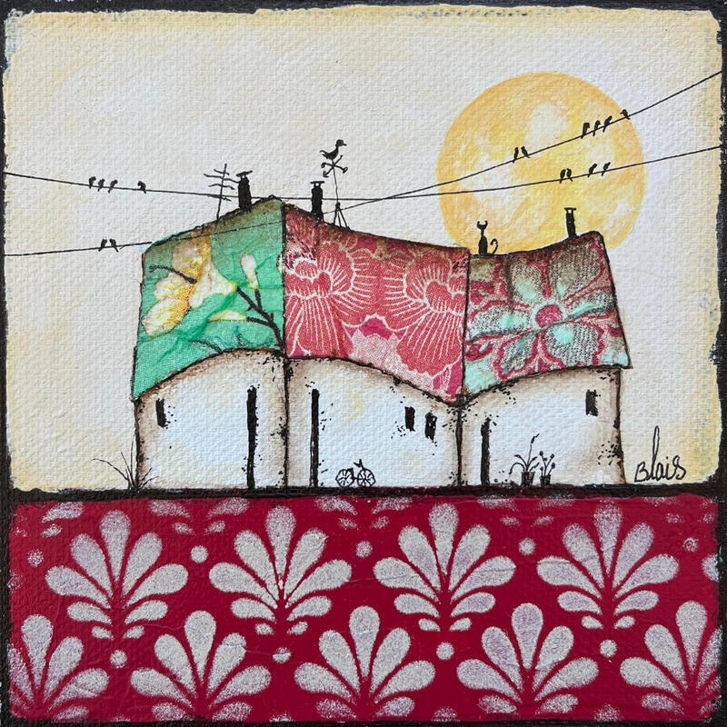The artist used Acrylic, Gluing media on Paper to create this Naive art, Small size painting.