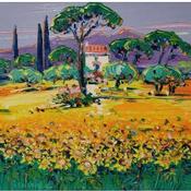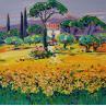 This unique and original contemporary artwork "Cabanon et tournesols" on the subject of Landscapes has been created by the contemporary artist Corbière Liisa.