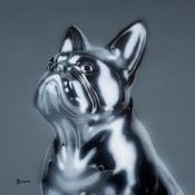 A fusion of the adorable and the metallic, this Boston Terrier portrait captures the essence of the animal in a bold, modern interpretation. The powerful contrasts of black and white underline the sharpness of the dog's features, while the metallic texture adds an almost futuristic dimension. The terrier's determined expression, sculpted in a cold, shiny material, lends the work an unexpected strength. A piece where the tenderness of the animal blends with the rigor of the metal, creating an intriguing encounter between tradition and innovation.