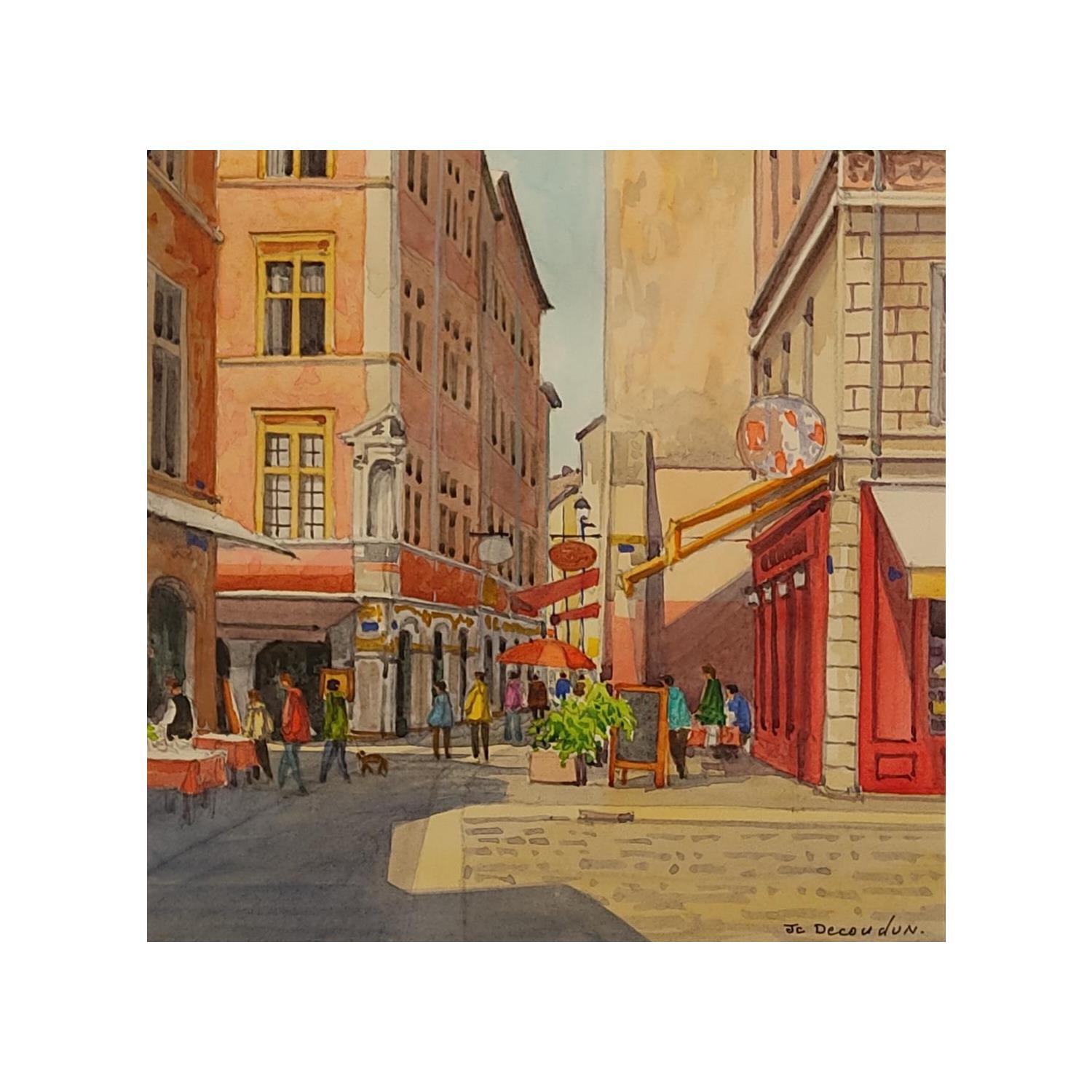 This unique and original contemporary artwork "Lyon rue St Jean, la vie en rose" on the subject of Urban has been created by the contemporary artist Decoudun Jean charles.