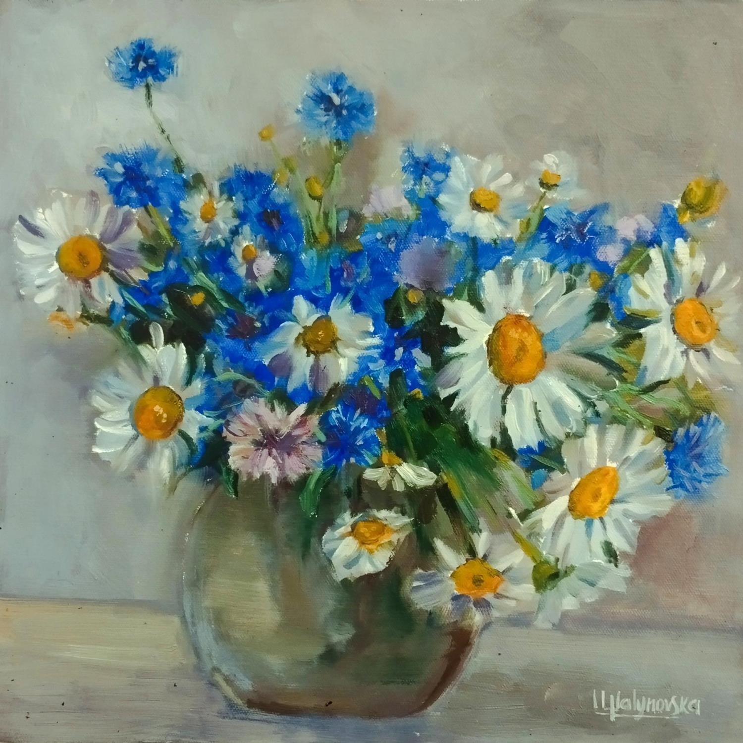 The oil painting entitled "Fleurs des Champs" is a delicate work created by Ukrainian artist Iryna Malynovska. This floral composition features a bouquet of white daisies and blue cornflowers, paying tribute to the simplicity and natural beauty of wild flowers.