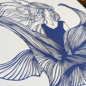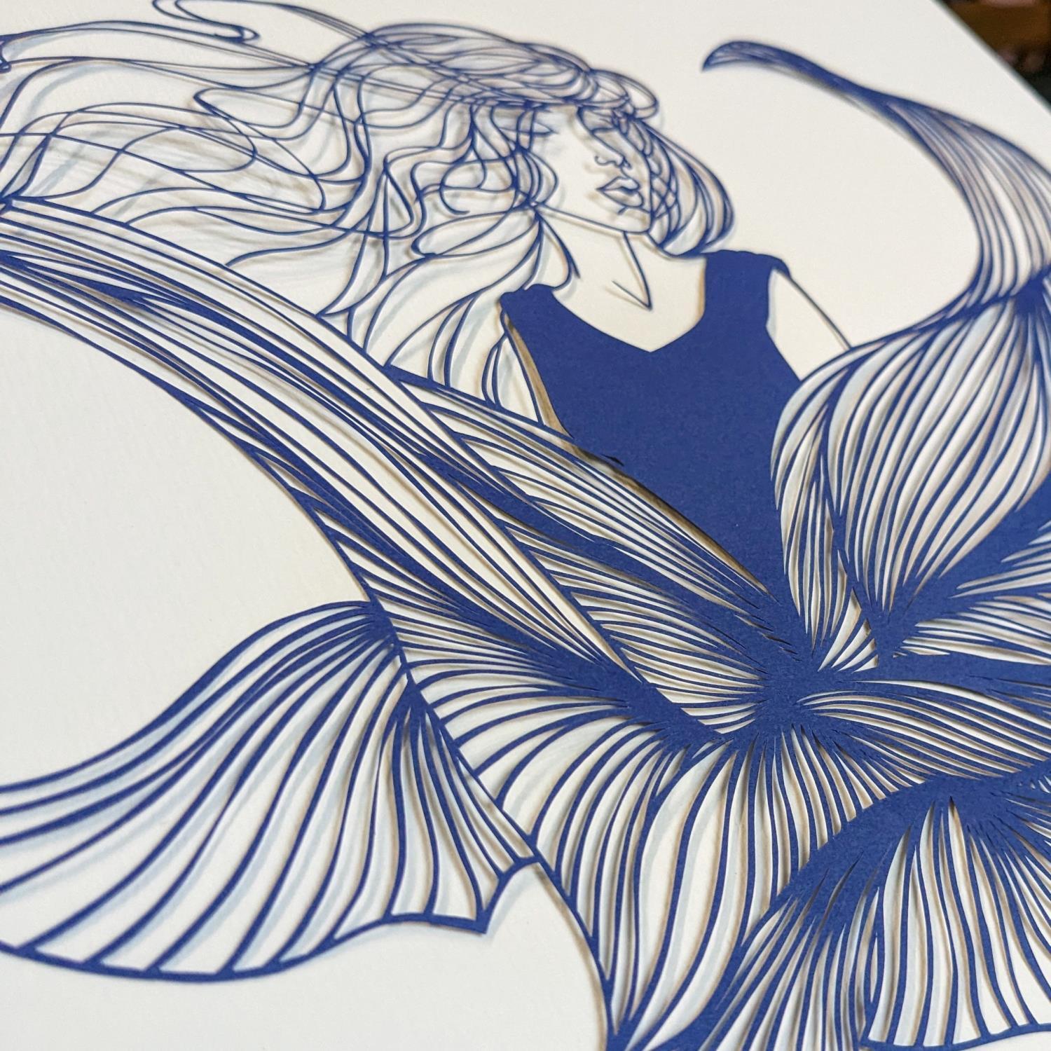 The artist drew and then carefully cut the blue paper with a scalpel to create this small format with a singular style.