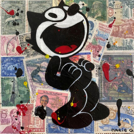 This unique and original contemporary artwork "F1 No Name 10039-21307-20260122-10" was created by contemporary artist Marie G. The artist used stamp collage and acrylic techniques to create this small-format Pop Art-style painting on wood with a Pop Icons theme.