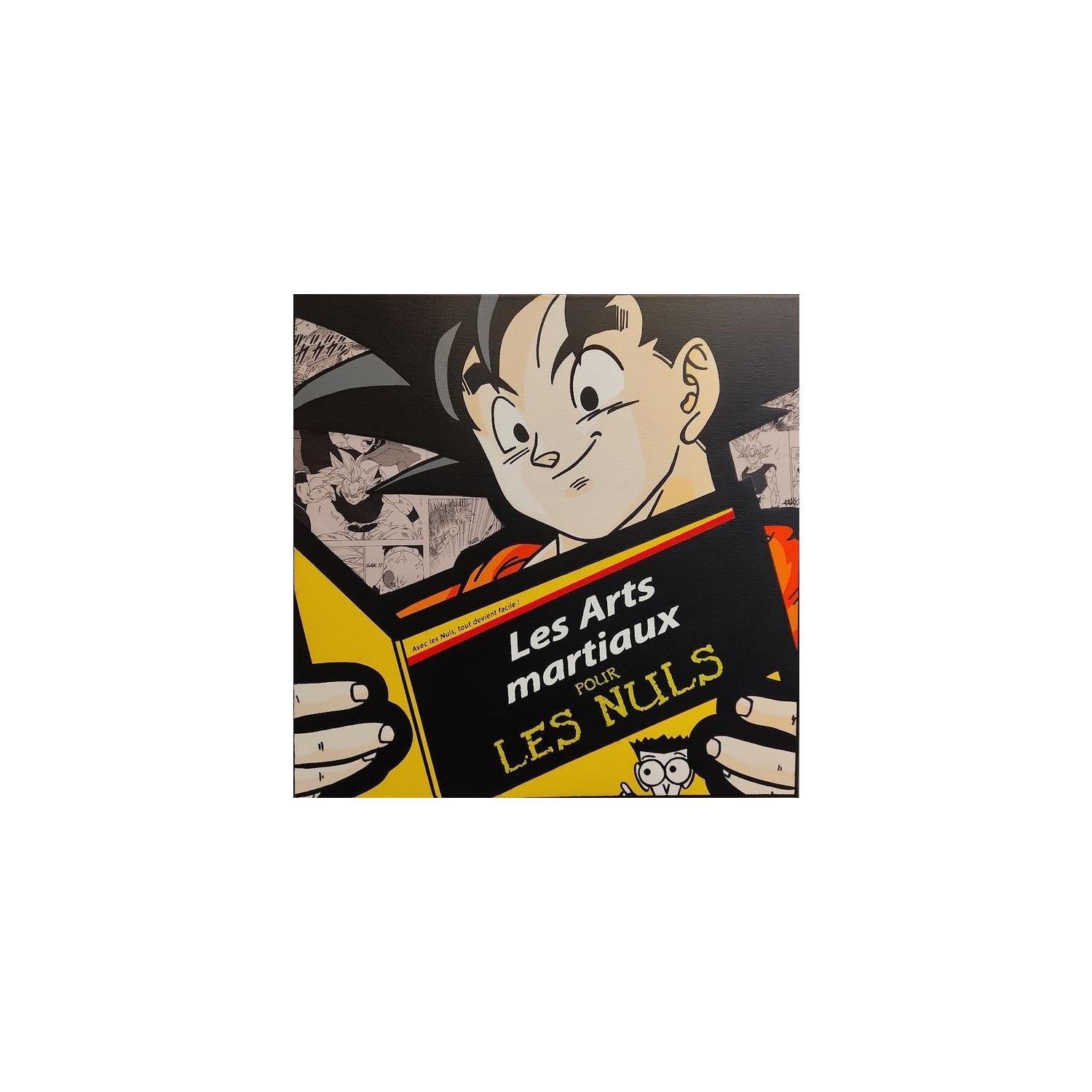 This unique and original contemporary artwork "Sangoku lit les Nuls" on the subject of Pop icons has been created by the contemporary artist Kalo.