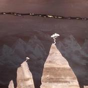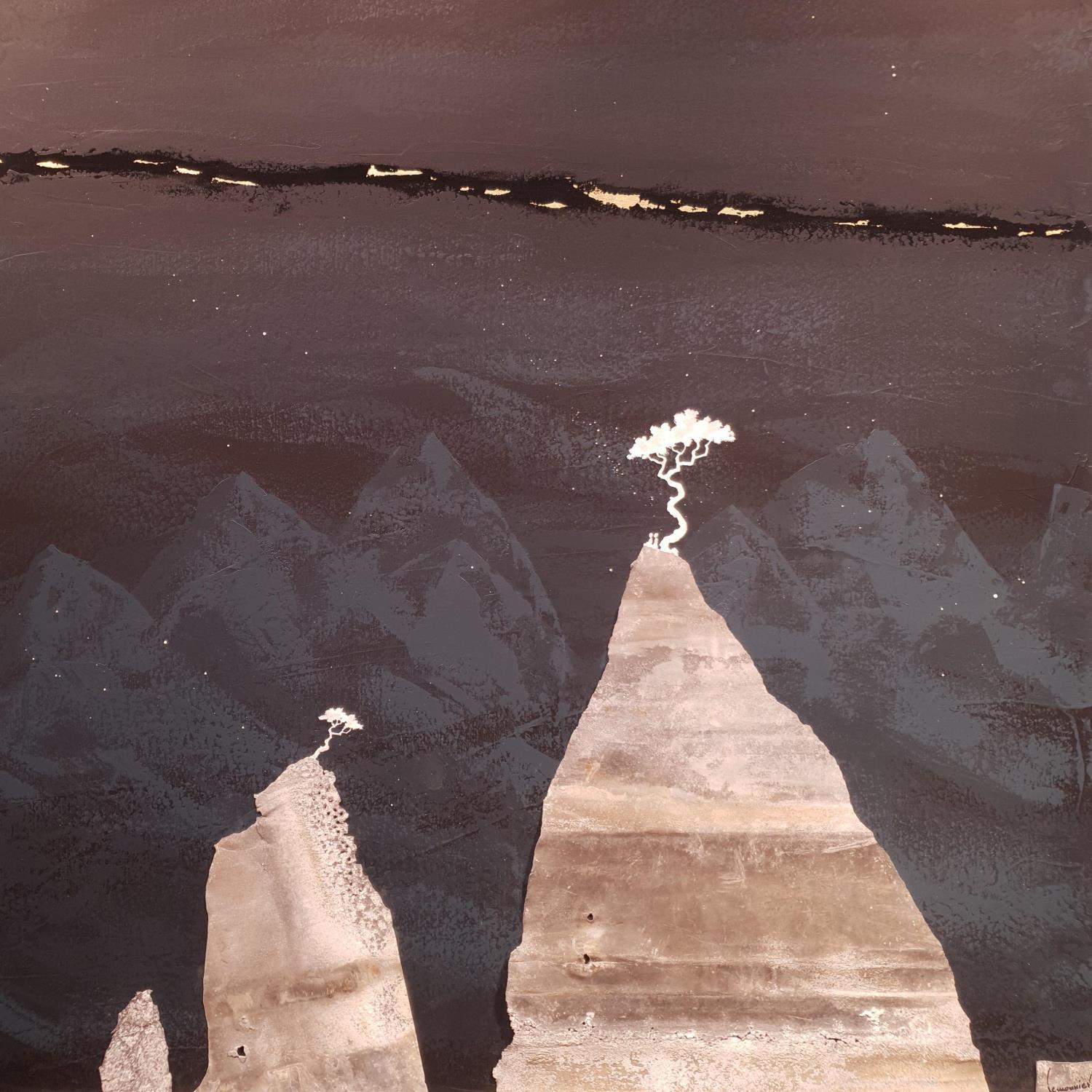 François-Régis Lemonnier’s paintings explore man and his environment. In his paintings, tiny characters float in large spaces, move about and meet each other, trying their own condition, solitude, joy, poverty, solidarity and oversight. Their tiny size highlights their great humility: man and his destiny, singular, happy or dramatic, in a world of constant change.\n\nFar from representation and realism, François-Régis Lemonnier’s paintings rise above and form open windows on the world, an immense world, swallowing an increasingly small, almost invisible man. These journeys to the centre of the universe are also journeys to our inner self, the deepest part of our inner being, where body and form disappear to leave space for the dissipation of the mind.