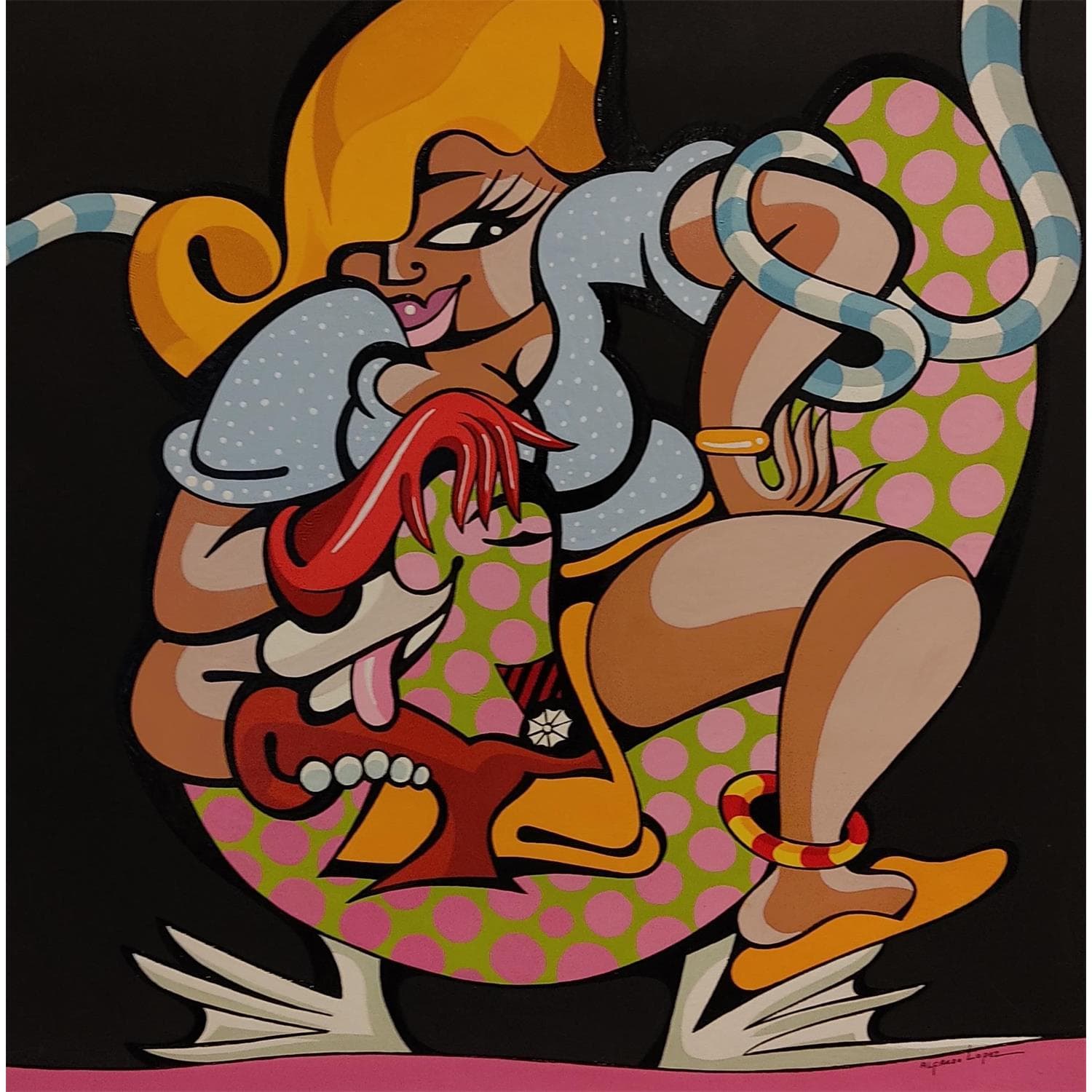 Born in 1964, Alfredo Lopez is a Bolivian-born artist who grew up in Spain before moving to Paris. Today, he lives and works near Chartres. His artistic career began in carefree times, with a vocation for freedom and sincerity. After working in advertising for fifteen years, he devoted himself fully to painting. His works, characterized by vivid colors and central characters, are narratives of everyday life, translating his neo-punk and benevolent sensibility.