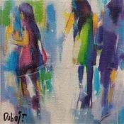 Anne Dubost is an award-winning French artist who enjoys capturing in her paintings people's fragility, determination, sensuality, as well as their transience. To find Anne Dubost's true intention one must read between the lines. The suggestion is indeed at the heart of her process, which spreads colours and textures in order to envelope the subjects with a halo. These circular movements, present in the paintings, lead the artist's characters in a dance that exacerbates the spinning palette, its tonalities and the contrasts packed with energy. A luminous work that contains all the vibrations of the world or, in the words of Régis Broustet, "a palette of spinning colours, much like a bouquet of fireworks".