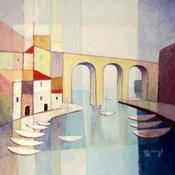 This unique and original contemporary artwork "AN229 LE PONT JAUNE" on the subjects of Marine, Landscapes, Urban has been created by the contemporary artist Burgi Roger.