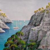 This unique and original contemporary artwork "AQ 36 Entrée dans la calanque" on the subjects of Marine, Nature, Landscapes has been created by the contemporary artist Burgi Roger.