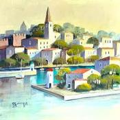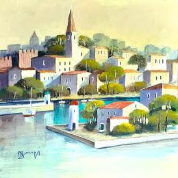This unique and original contemporary artwork "AR57 L'ENTREE DU PORT (SARDAIGNE)" on the subjects of Marine, Landscapes, Urban has been created by the contemporary artist Burgi Roger.