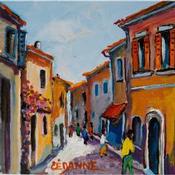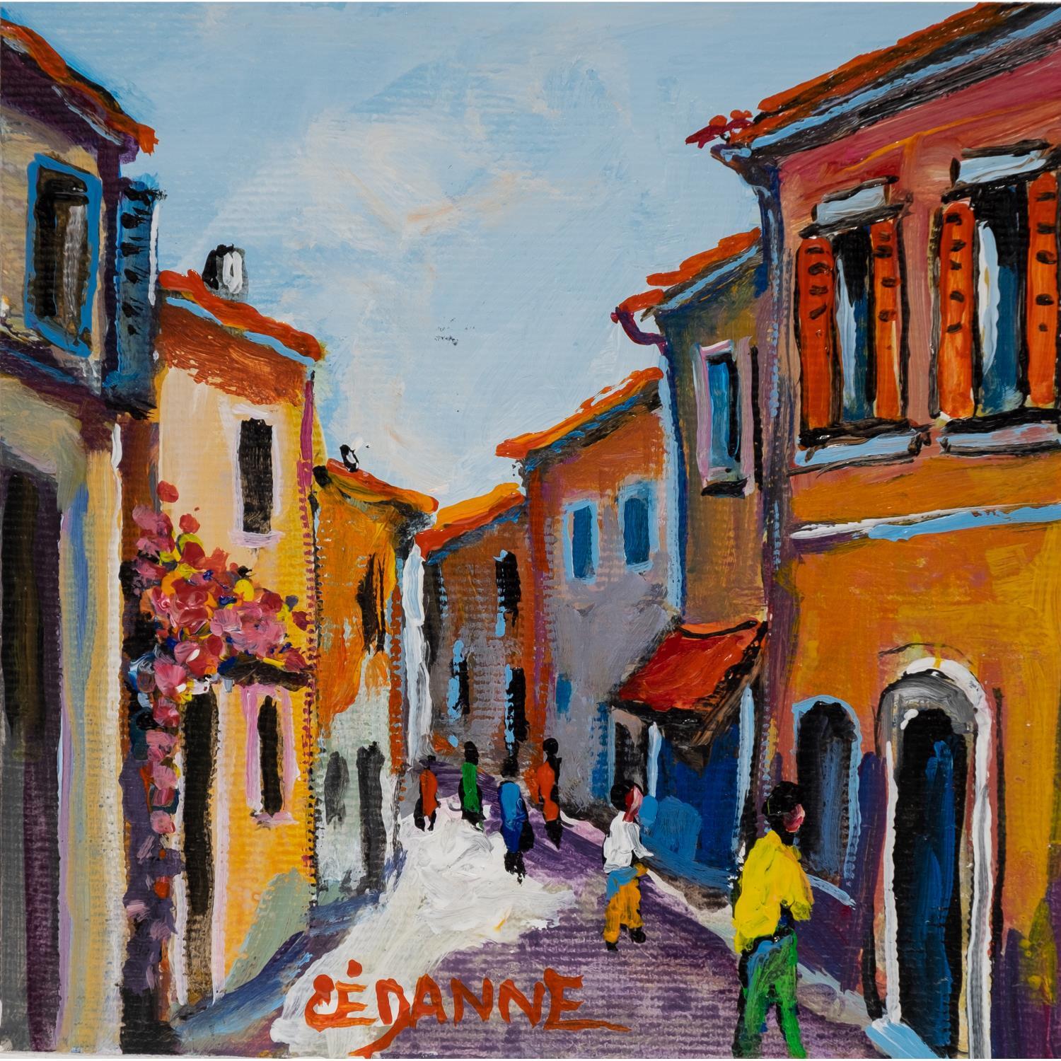 This unique and original contemporary artwork "Animation et couleurs chaudes dans la vieillle rue" on the subjects of Landscapes, Urban, Life style has been created by the contemporary artist Cédanne.