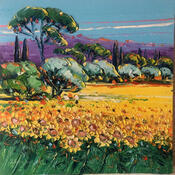 This unique and original contemporary artwork "Saison des tournesols" on the subject of Landscapes has been created by the contemporary artist Corbière Liisa.
