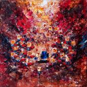 Le concert avec pianiste is a work that oscillates between abstraction in the periphery and naive art in the center and the representation of the instrumentalists. The motif is painted in knife and oil, and plays on a harmony of warm colors (shades of red, orange) and metallics (gold, copper, silver...). The square heads of the figures are inspired by Nicolas de Staël's "Parc des Princes" series. The staging highlights the central pianist, playing on circularity (the formation) and verticality (the background). The conductor, isolated and in a masterly posture, concludes the lower part of the work. The overall tone is flamboyant or baroque... depending on one's sensibilities.