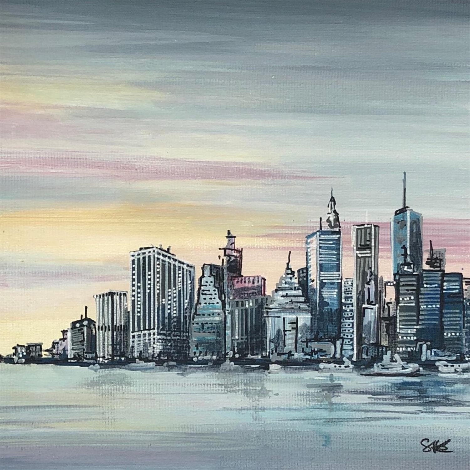 This unique and original contemporary artwork "New York au crépuscule" on the subject of Urban has been created by the contemporary artist Touras Sophie-Kim .