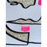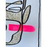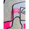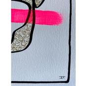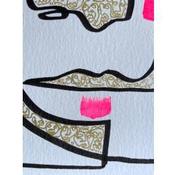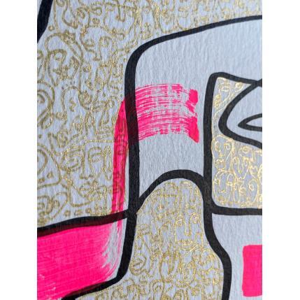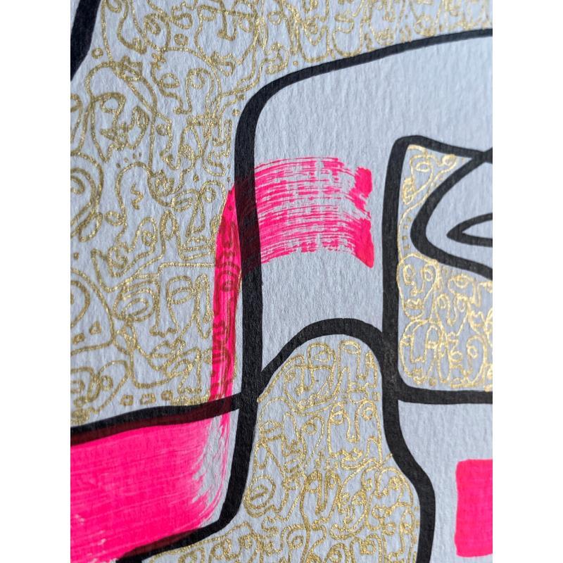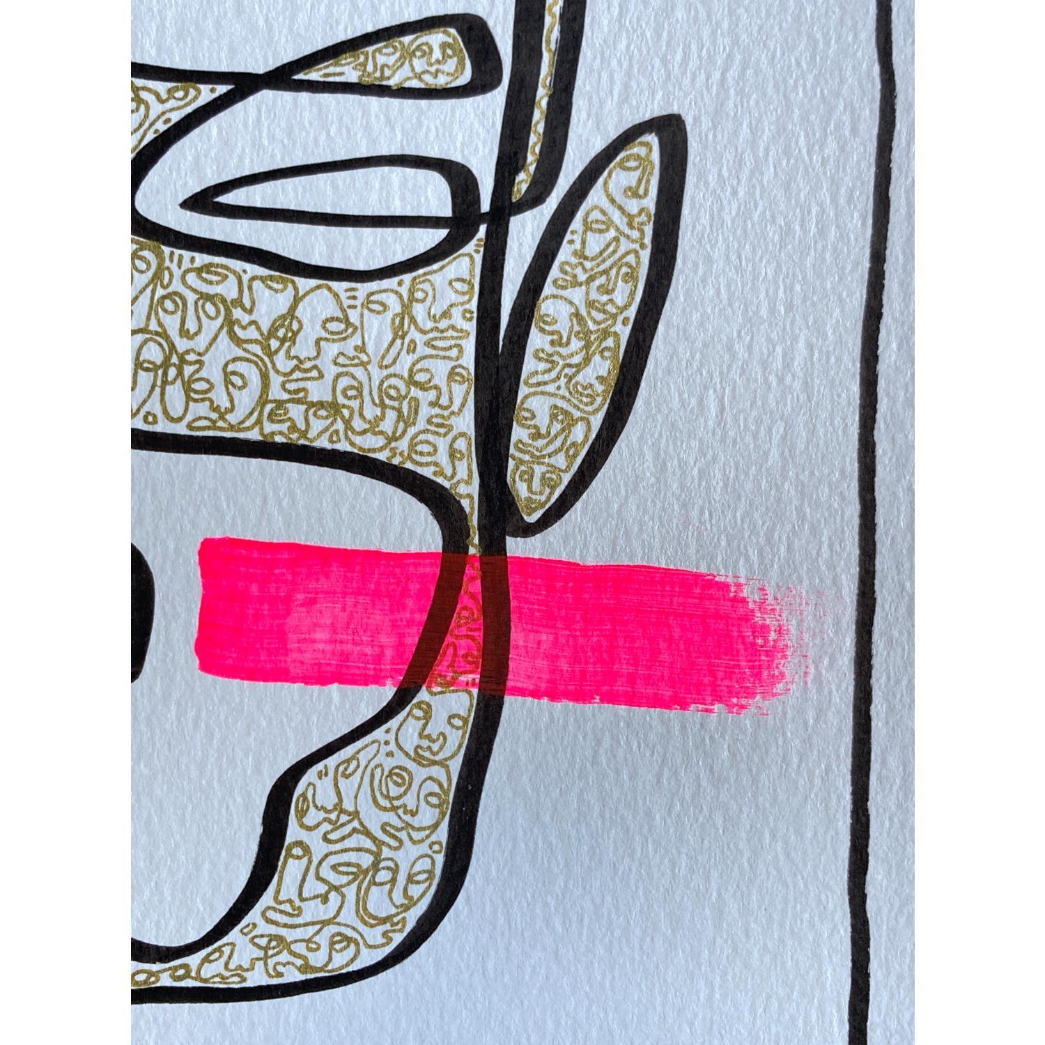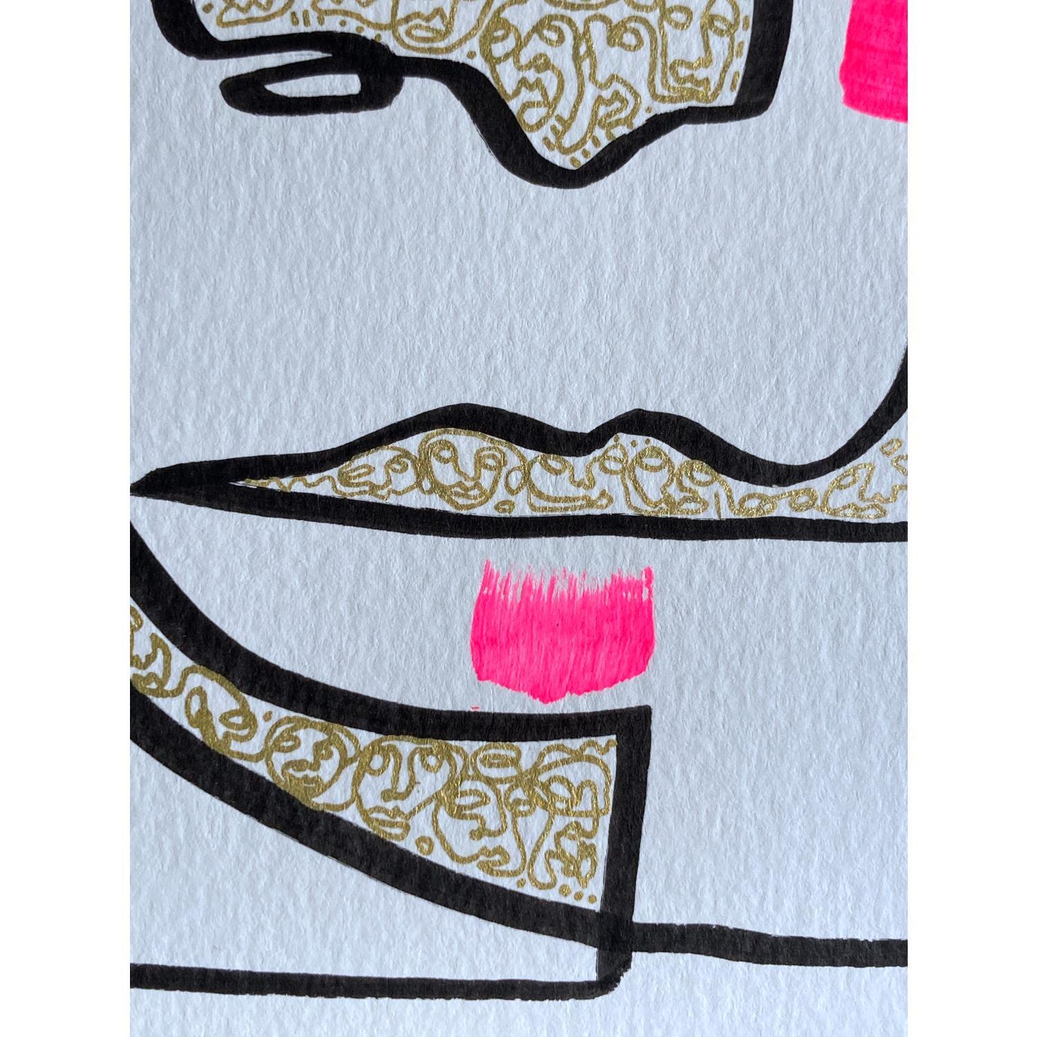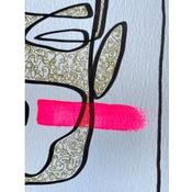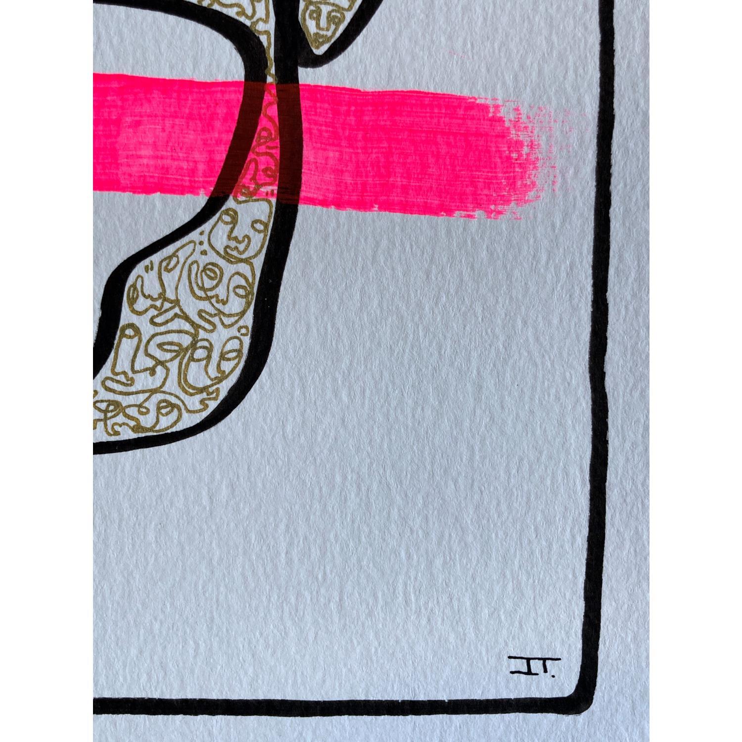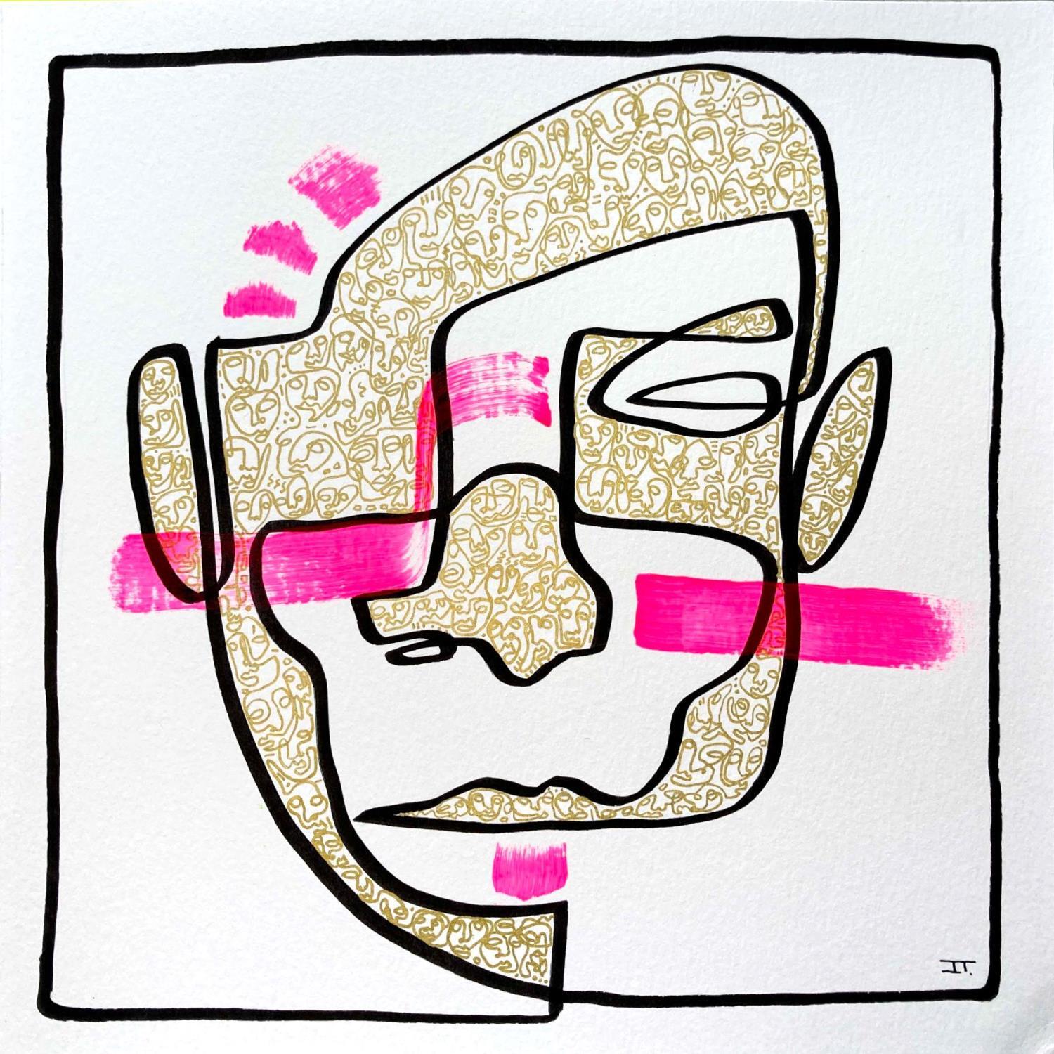 This unique work of art, is a portrait of a person from the front and made of a single continuous black line in Posca, filled with a golden line creating numerous agglomerated faces. It has additional details of thick lines in fluorescent pink that give volume to the face and a slightly tribal style.