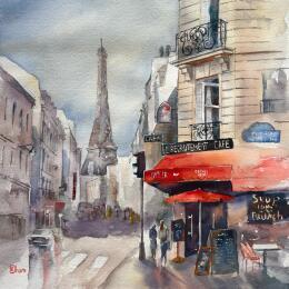Le café Le Recrutement sur la place du Panthéon à Paris. L’aquarelle capte l’animation discrète de la rue, la façade emblématique au store rouge et l’atmosphère vivante du Quartier Latin.