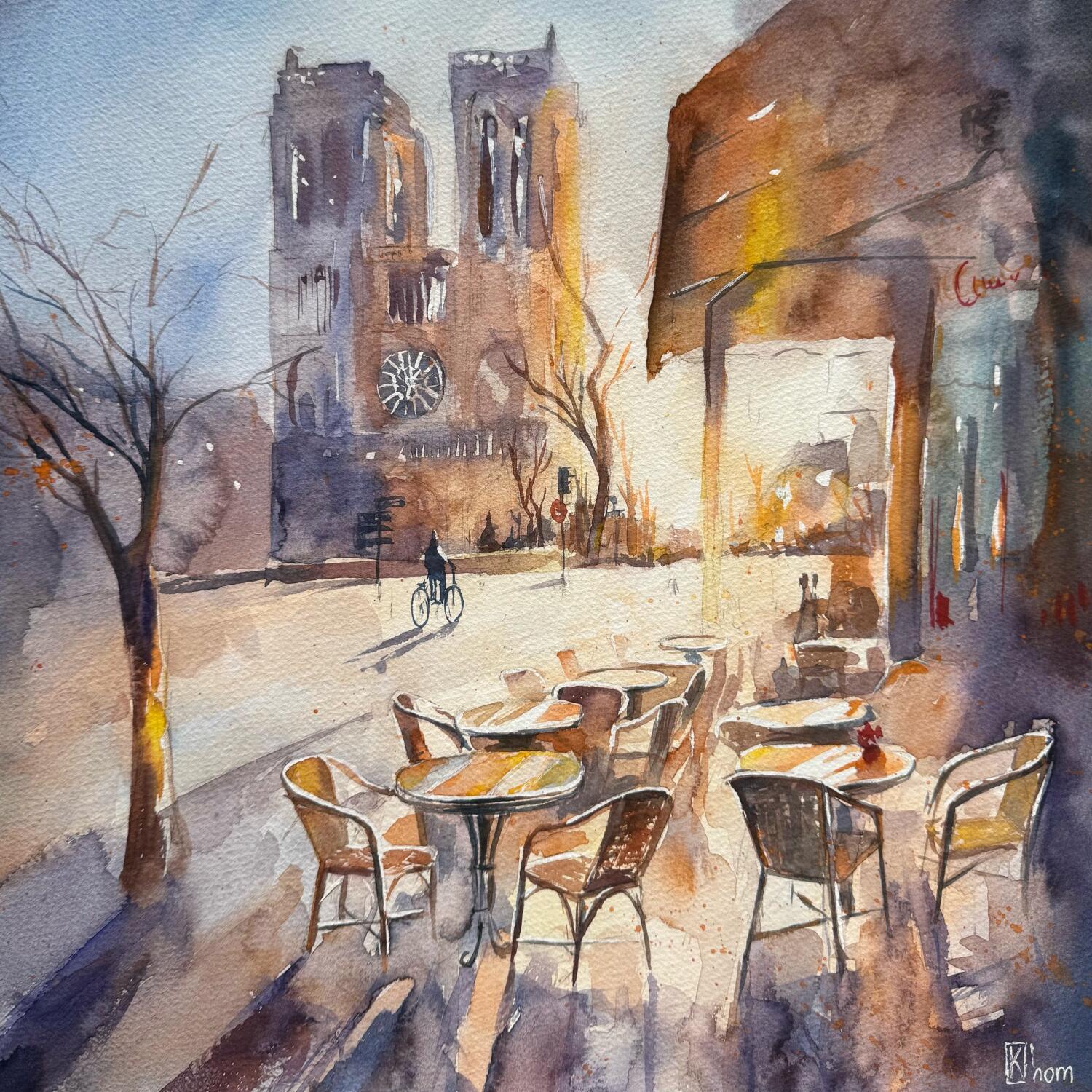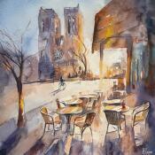 A café terrace facing Notre-Dame de Paris, bathed in the soft morning light. The watercolor captures the calm of the square, the tables still empty, and the majestic presence of the cathedral.