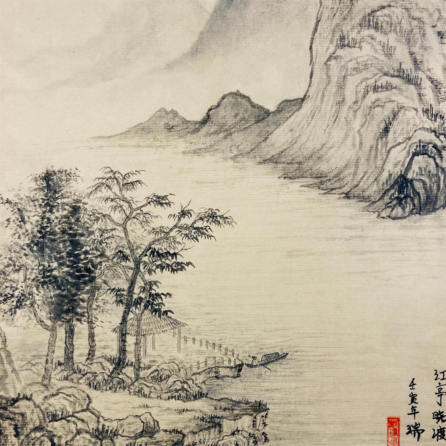 This unique and original contemporary artwork "A little boat looking up at the high mountains" on the subjects of Landscapes, Life style has been created by the contemporary artist Amblard Rui.