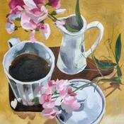 Painting coffee and pink flowers by Ulrich Julia | Painting Figurative Wood Oil