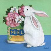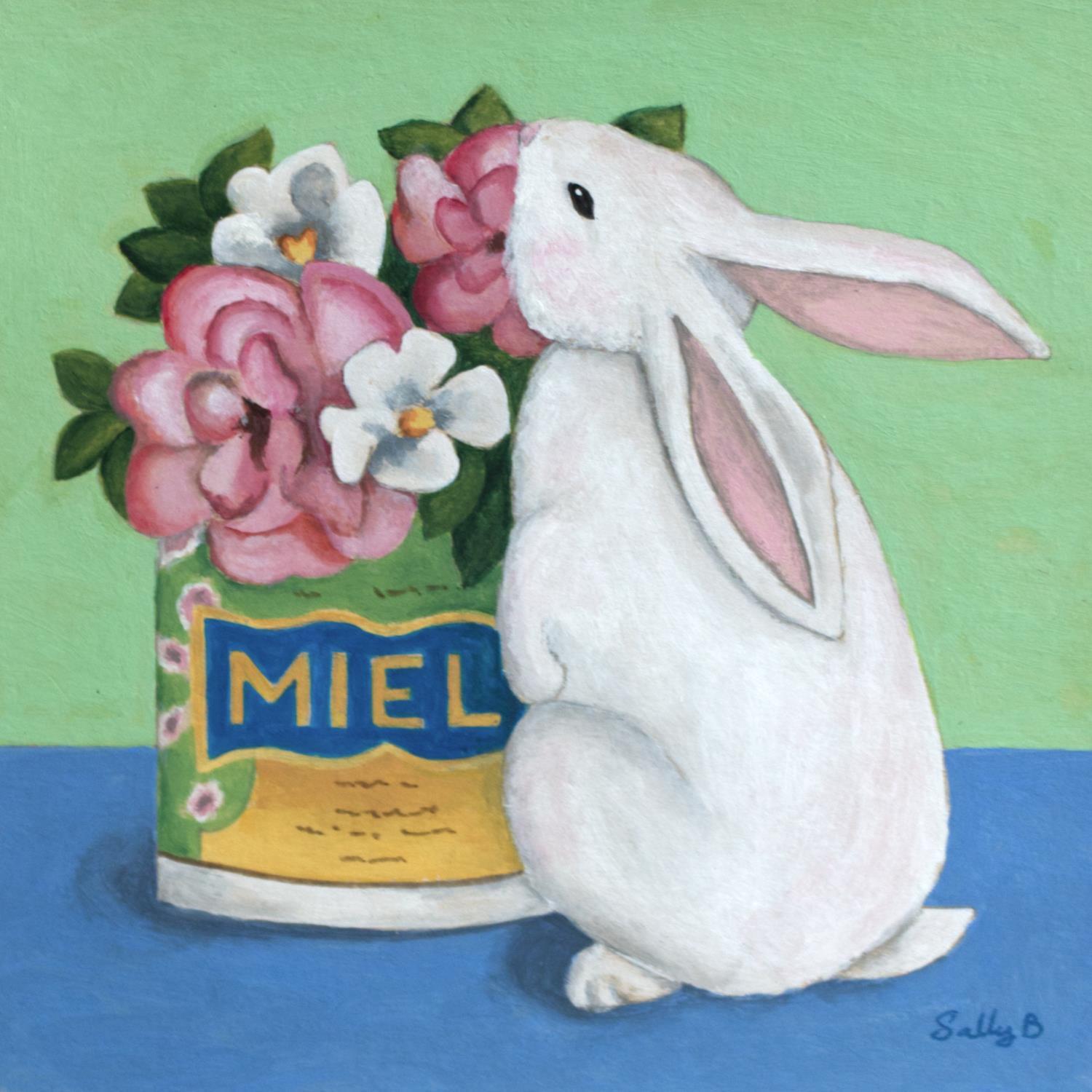 This unique and original contemporary artwork "Rabbit and flowers in a honey pot" was created by contemporary artist Sally B.